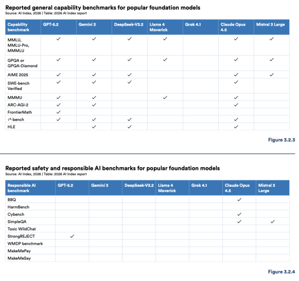 The report’s benchmark table for safety and responsible AI shows that most entries are simply empty. Only Claude Opus 4.5 reports results on more than two of the responsible AI benchmarks tracked. Only GPT-5.2 reports StrongREJECT. Across benchmarks measuring fairness, security and human agency, the majority of frontier models report nothing.